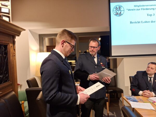 Dieser berichtete über die Tätigkeit der Freiwilligen Feuerwehr der Stadt Willebadessen. Anschließend überreichte er der Brandmeisterin Nicole Genau und dem stellvertretenden Brandmeister Andrew Behler die Teilnahmebescheinigungen für die beiden Gruppen beim Leistungsnachweis.