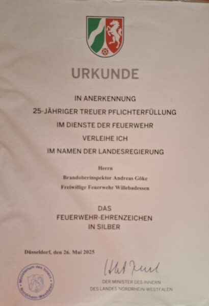 Die Auszeichnung Feuerwehr-Ehrenzeichen in Silber wurde dem Brandoberinspektor Andreas Göke von der Löschgruppe Niesen überreicht.