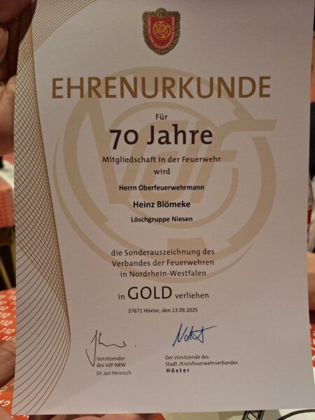 Ein Höhepunkt der Veranstaltung war die Verleihung einer Urkunde für 70 Jahre Mitgliedschaft in der Feuerwehr an den Oberfeuerwehrmann Heinz Blömeke.