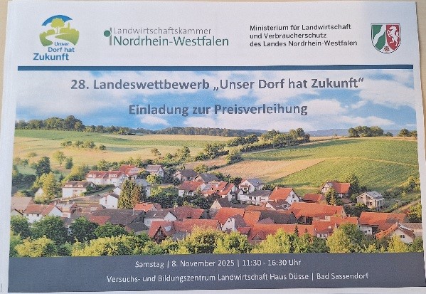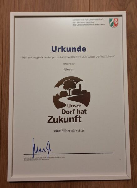 Am 8. November war die Dorfgemeinschaft Niesen in Bad Sassendorf zur Preisverleihung im Landeswettbewerb „Unser Dorf hat Zukunft“. Niesen hatte sich im letzten Jahr durch den 1. Platz im Kreiswettbewerb für den Landeswettbewerb qualifiziert.