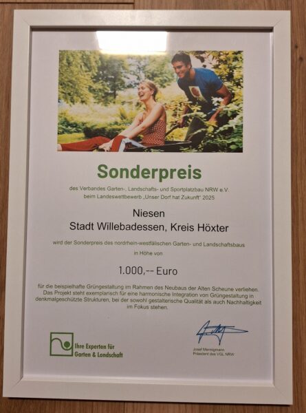 Worüber wir uns ebenfalls freuen konnten, ist ein Sonderpreis vom Verband der Garten- Landschafts- und Sportplatzbauer. Den Sonderpreis haben wir für den naturnahen Umgang beim Abriss und Wiederaufbau der Dorfscheune erhalten.